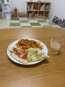 肝心の食べる方のメニューですが、ナポリタン、ピザ(ミックスとしらす)、白菜と